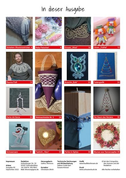 Die Handarbeitszeitschrift "Ariana" ist im Oktober 2018 geboren und wird zwei mal im Jahr herausgegeben. Dort sind auf 32 Seiten die Vorlagen mit Fotos und Beschreibungen für verschiedene Handarbeitsarten veröffentlicht.