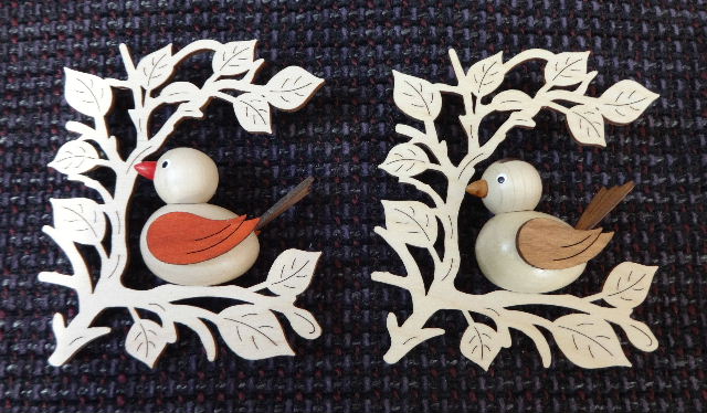 Einhänger aus 3 mm starkem Birkensperrholz, mit  gedrechselten Vögelchen. Die Motive haben eine  Größe von  cirka
