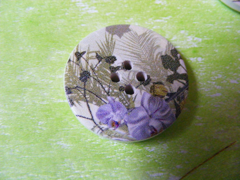 Sehr schöne großer Knopf (3 cm Durchmessser) mit einem wundervollen Druck. Super für Westen, Jacken, Pullis & Co aber auch zum Verzeiren verschiedener Dekoelemente...