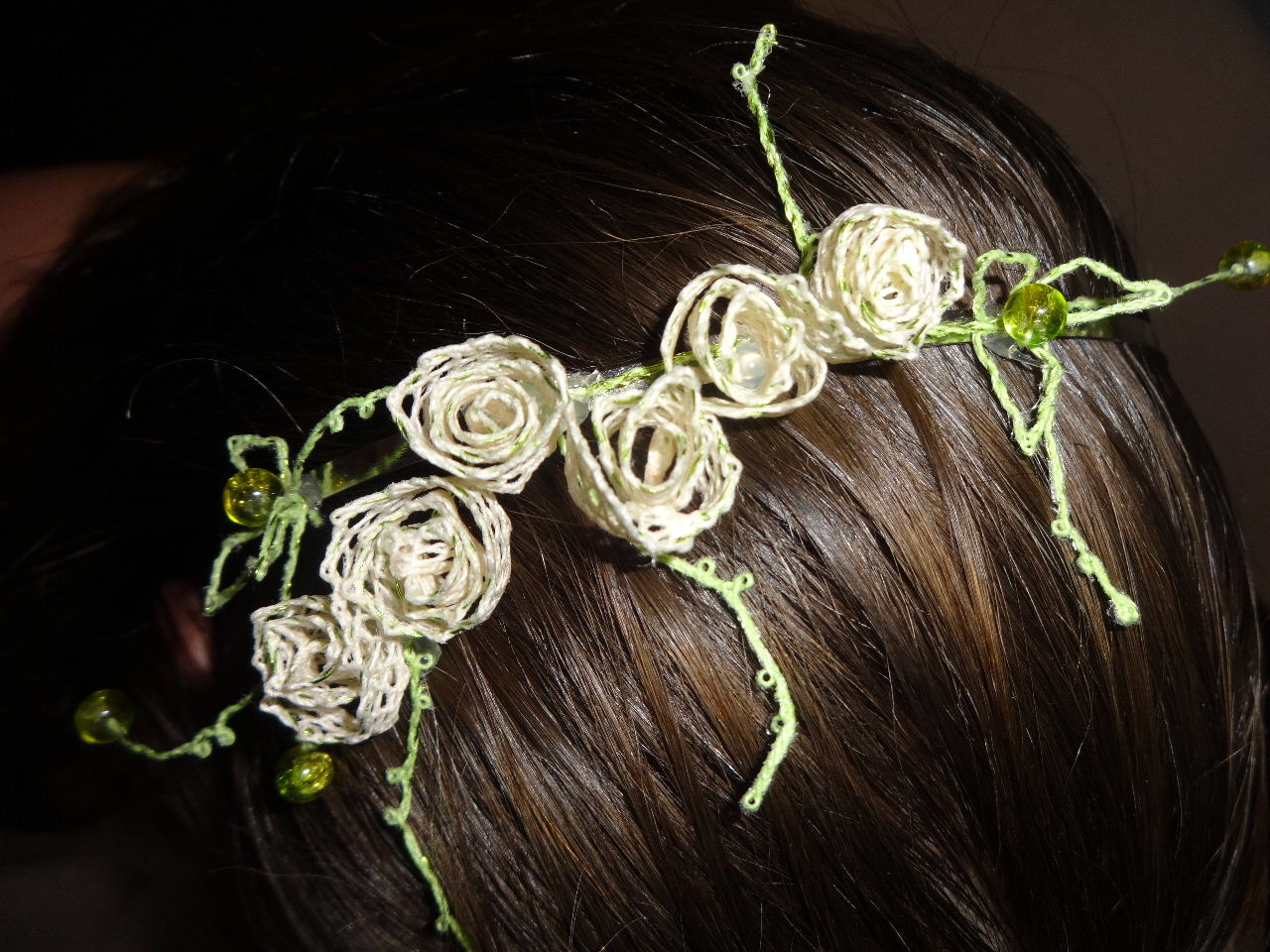 Hier ein toller Haarreifen  ganz klassich in silber und weiß als Brautschmuck.Oder mit Grün und zarten Pastelltönen für die Blumenkinder oder aber auch zum Schulanfang.