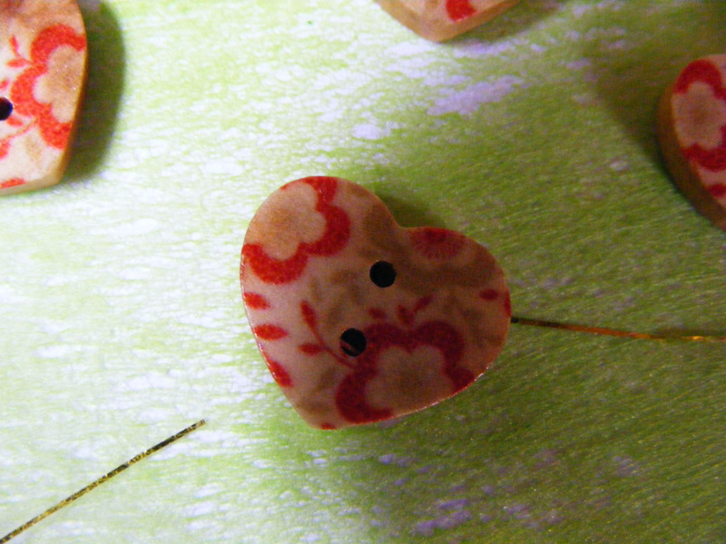 Wunderschön bedruckte Holzknöpfe in Herzform. Toll für Landhausmode und Dekorationen.