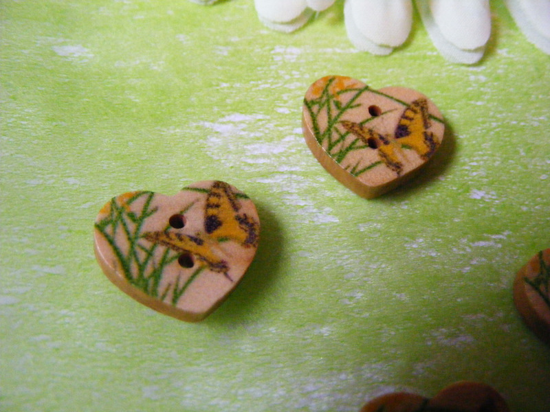 Wunderschön bedruckte Holzknöpfe in Herzform. Toll für Landhausmode und Dekorationen.