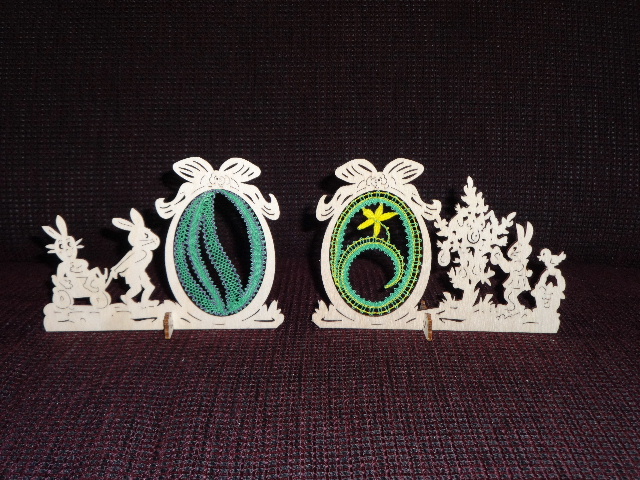 Die Eier passen in die Holzrahmen "Ei mit Schleife" und die Aufsteller "Hase mit Bollerwagen", "Hasenmama mit Kinderwagen" und "Eierbäumchen".
