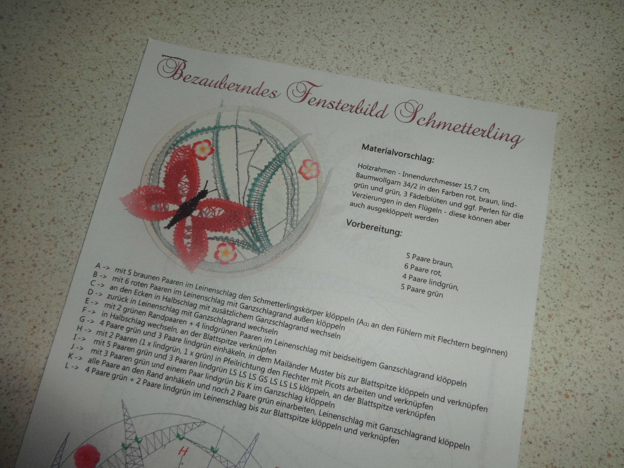 Klöppelbrief für ein filligranes Fensterbild mit einem tollen 3D-Schmetterling. Die fertige Arbeit hat eine Durchmesser von etwa 16 cm und ist für Holzrahmen mit 15,7 cm Innendurchmesser bestens geeignet..