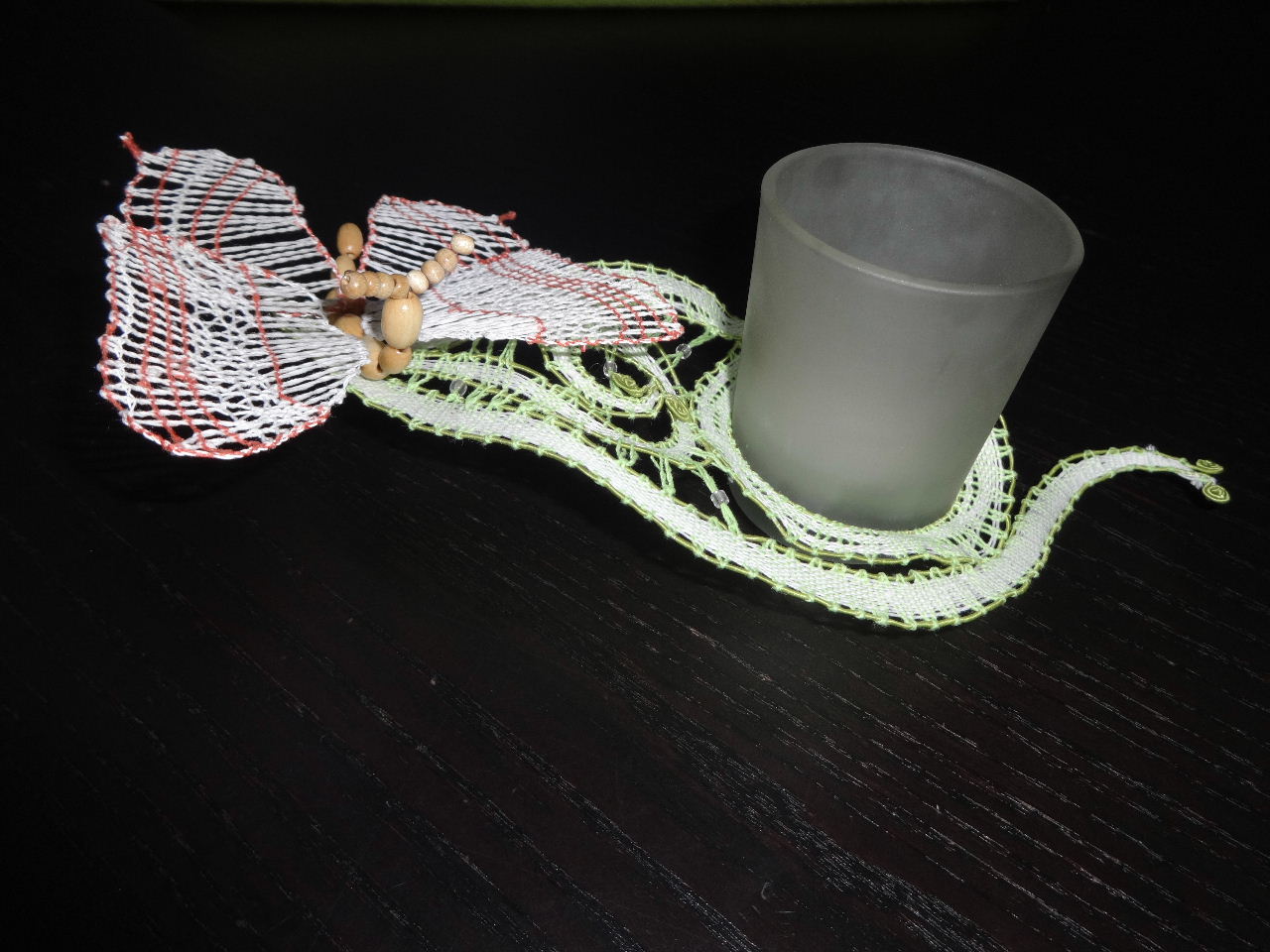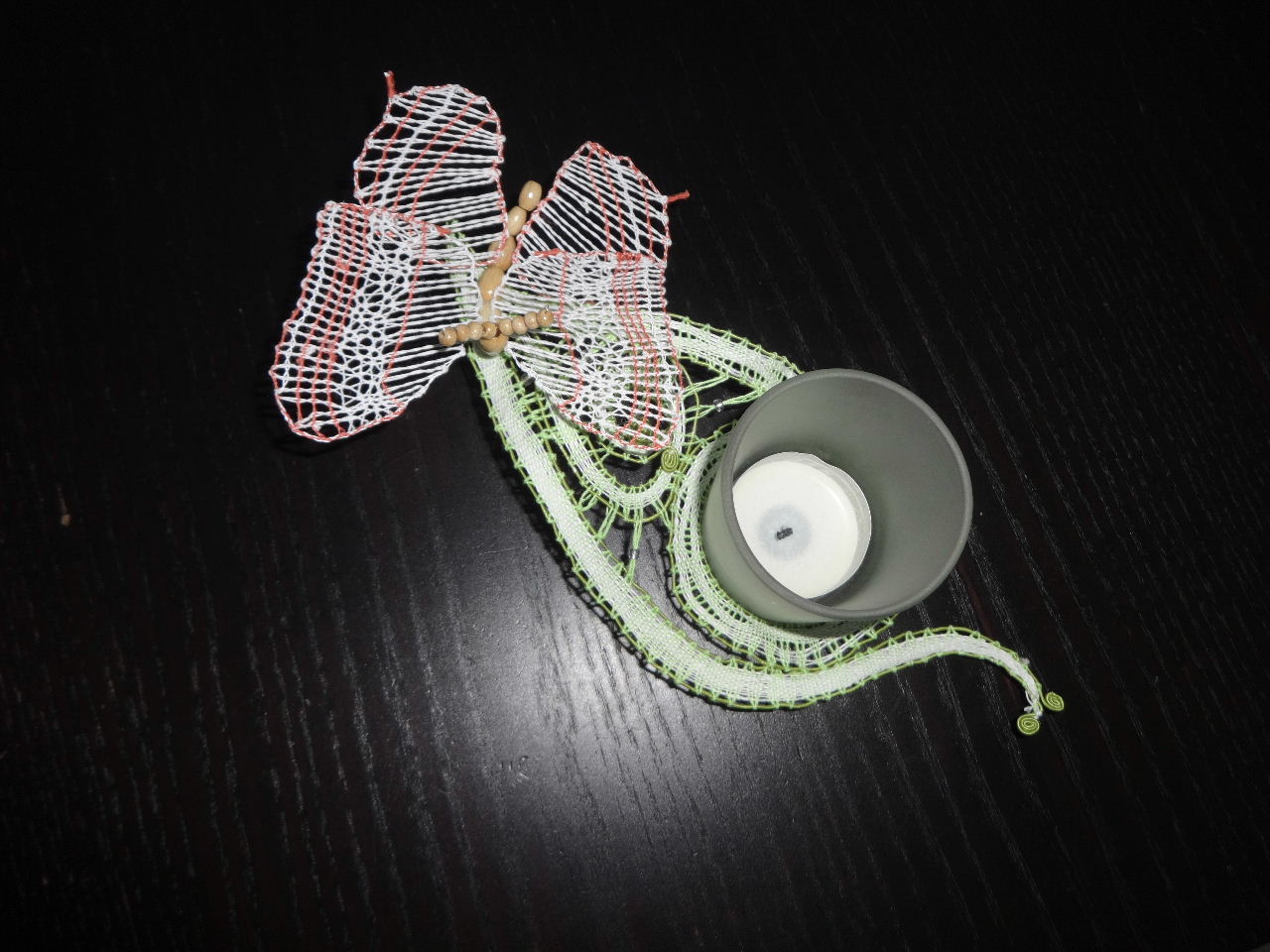 Das Materialset beinhaltet 10 kleine klare Glasperlen, die erforderlichen Holzperlen für den Schmetterlingskörper, ein Teelichtglas sowie den Klöppelbrief inkl. farbiger Anleitung.